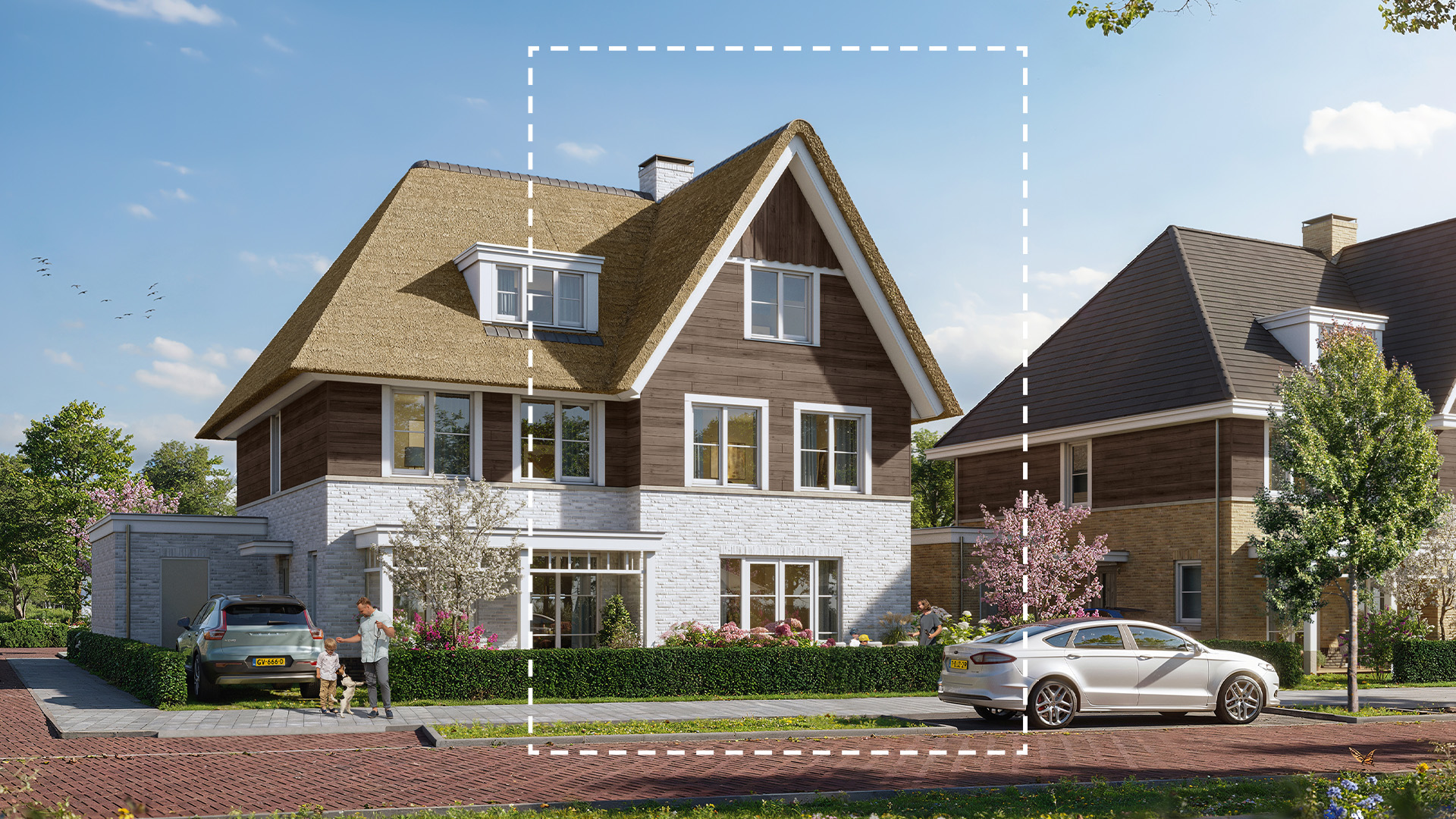 Statig en vrijstaand met een beukmaat van 6 m, vormt deze villa in fase 1 een blikvanger aan de Poelkade. Circa 216 m² woonoppervlak, karakteristieke rieten kap en elegante architectuur bieden stijl en comfort.